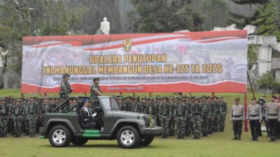 Komandan Korem 023/KS Kolonel Inf Jansen P. Nainggolan, M.Sc., selaku Penanggung Jawab Keberhasilan Pelaksanaan (PKP) TMMD Ke-125 Kodim 0205/TK, mendampingi Pangdam I/BB Mayjen TNI Rio Firdianto menutup secara resmi TNI Manunggal Membangun Desa (TMMD) Ke-125 di Lapangan Micky Holiday, Kecamatan Berastagi, Kabupaten Karo, Provinsi Sumatera Utara, Kamis (21/08/25).