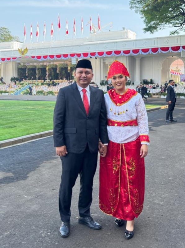Di antara deretan tokoh penting yang hadir, tampak sosok yang mencuri perhatian: Eko Rajagukguk, Kepala Bidang Intelijen dan Penindakan Keimigrasian Bandara Internasional Soekarno-Hatta. Berpakaian rapi dengan setelan jas formal dan dasi merah yang mencolok, ia tampil elegan didampingi sang istri yang anggun mengenakan busana adat. Keduanya tampak serasi, tak henti menerima sapaan hangat dari tamu lainnya.