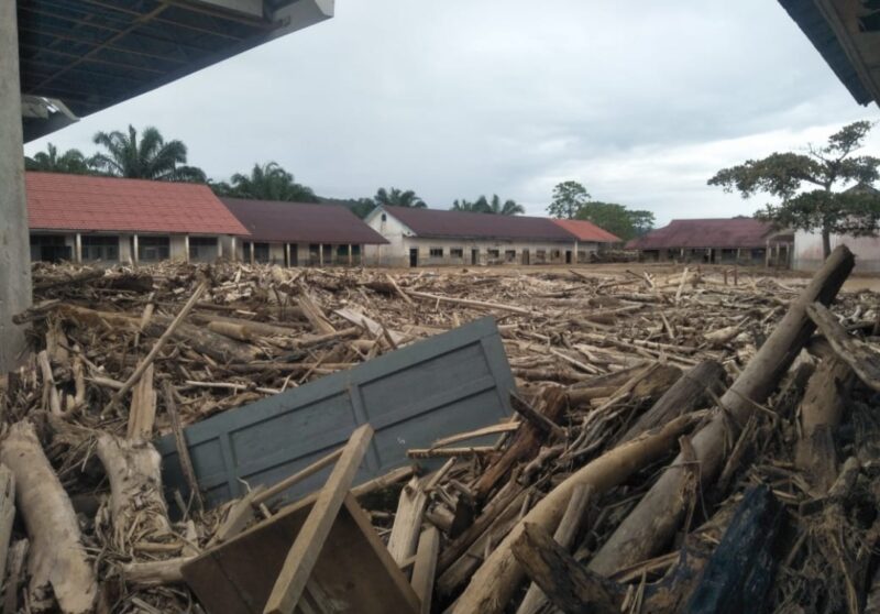 Seluruh bangunan sekolah tersebut di kelilingi kayu gelondongan dan sampah kayu yang di bawa banjir bandang ,yang diduga banyaknya penebangan kayu di pegunungan daerah aliran sungai.
