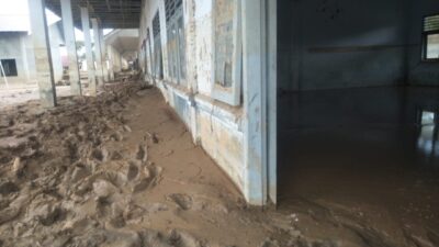 Di dalam ruang kelas terlihat lumpur yang sangat tebal dan begitu juga di halaman sekolah banyak terlihat kayu bulat dan sampah kayu, hingga pintu gerbang sekolah di tutupi kayu gelondongan.
