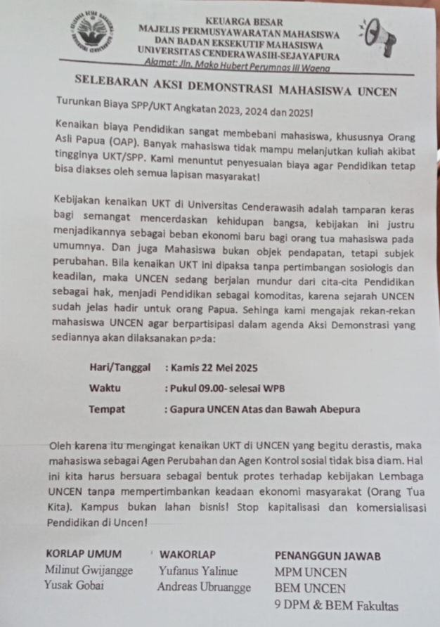 Aksi demonstrasi mahasiswa Universitas Cenderawasih (Uncen) yang digelar di Gapura Pintu Masuk Kampus, Kamis (22/5/25), berakhir ricuh. Mahasiswa yang tergabung dalam Badan Eksekutif Mahasiswa (BEM) dan Majelis Permusyawaratan Mahasiswa (MPM) terlibat bentrokan dengan aparat penegak hukum (APH) setelah dihalangi keluar dari area kampus.